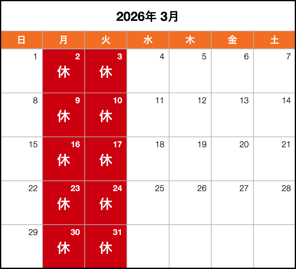 2026年3月のお休みを更新いたしました。