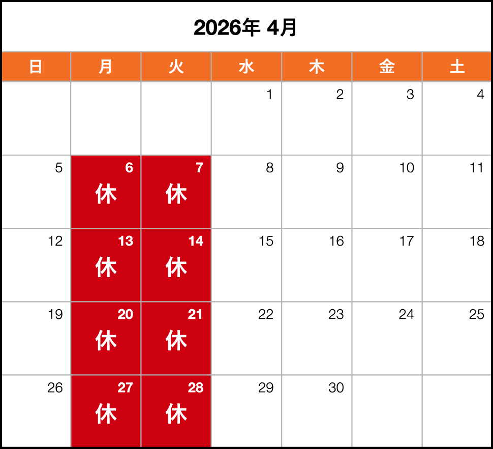 お休みは下記カレンダーをご確認ください。予定は変更される場合がございますので、直接お店にご確認ください。